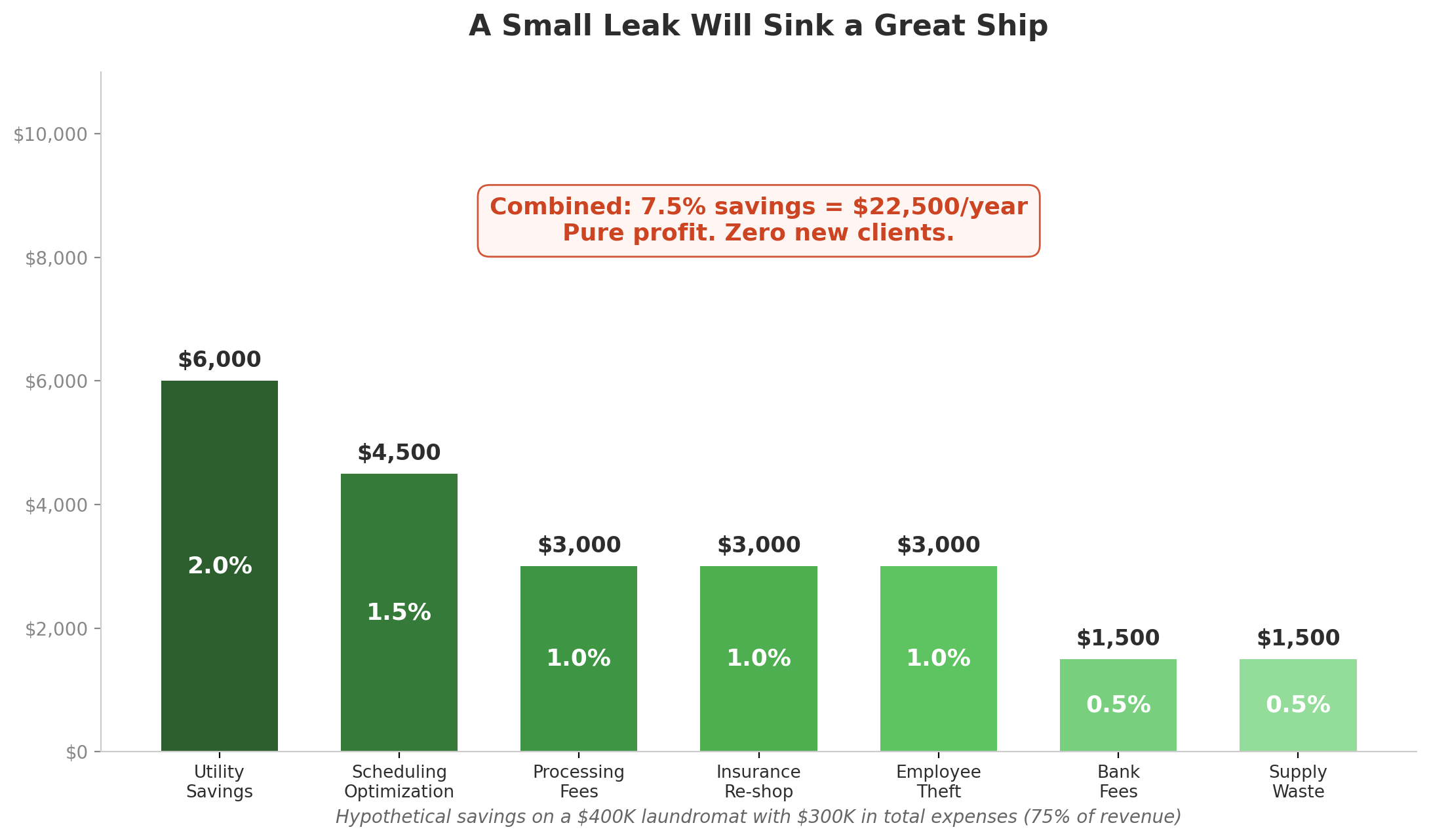 Utility savings at 2%. Scheduling optimization at 1.5%. Processing fees, insurance, and employee theft each at 1%. Bank fees and supply waste each at 0.5%. Individually, none of these numbers are aggressive. Combined, they represent 7.5% in total savings — roughly $22,500 a year that goes straight to the bottom line.