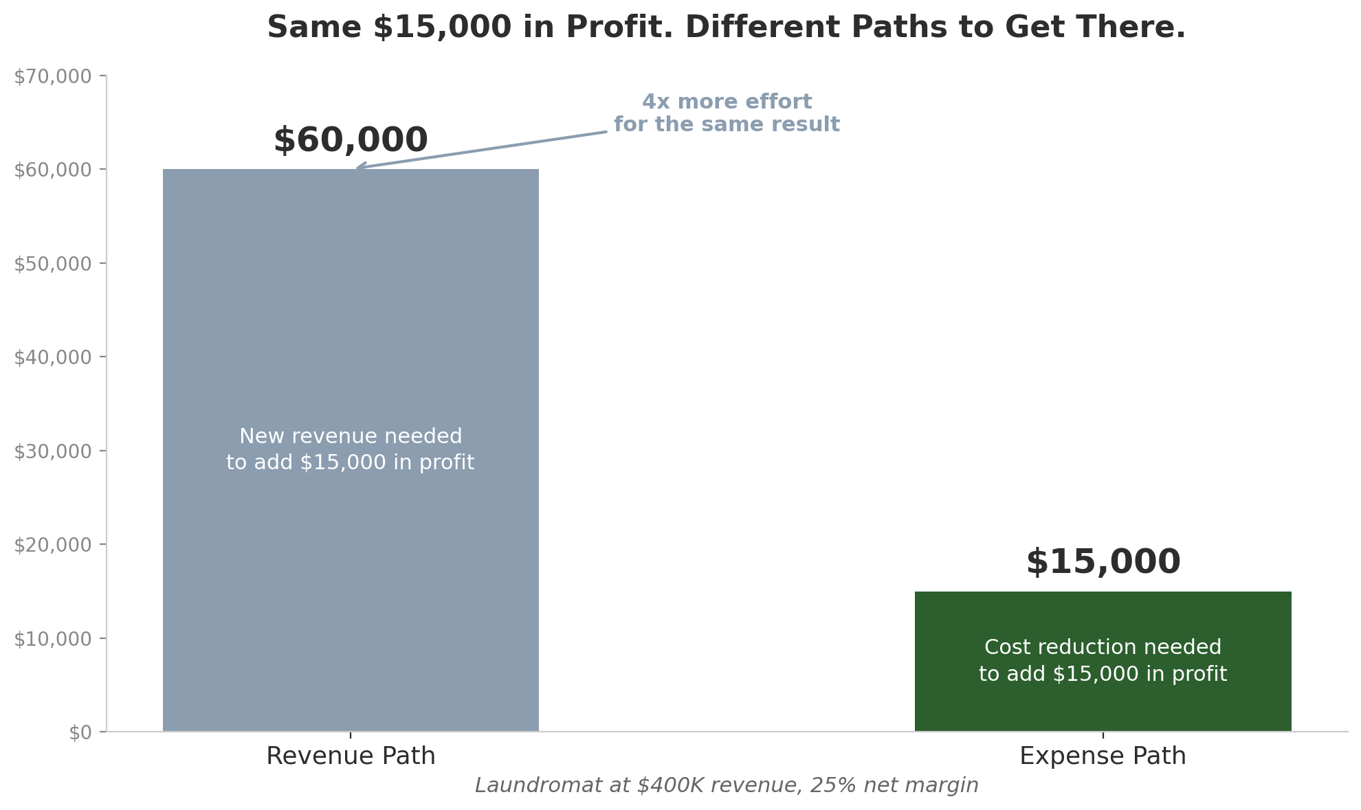 Here's how that works in practice. Say you're running a laundromat that does $400,000 a year in gross revenue with a 25% net margin. That means $100,000 in net profit and $300,000 in total expenses. If you want to add $15,000 to your profit from the revenue side, you'd need to generate $60,000 in new revenue, because at a 25% margin, only a quarter of every new dollar drops to the bottom line. The other $45,000 goes to cover the costs of earning it. But if you find $15,000 in cost reductions across your expense categories, every dollar of that goes straight to profit. Same result. One path requires four times the effort.